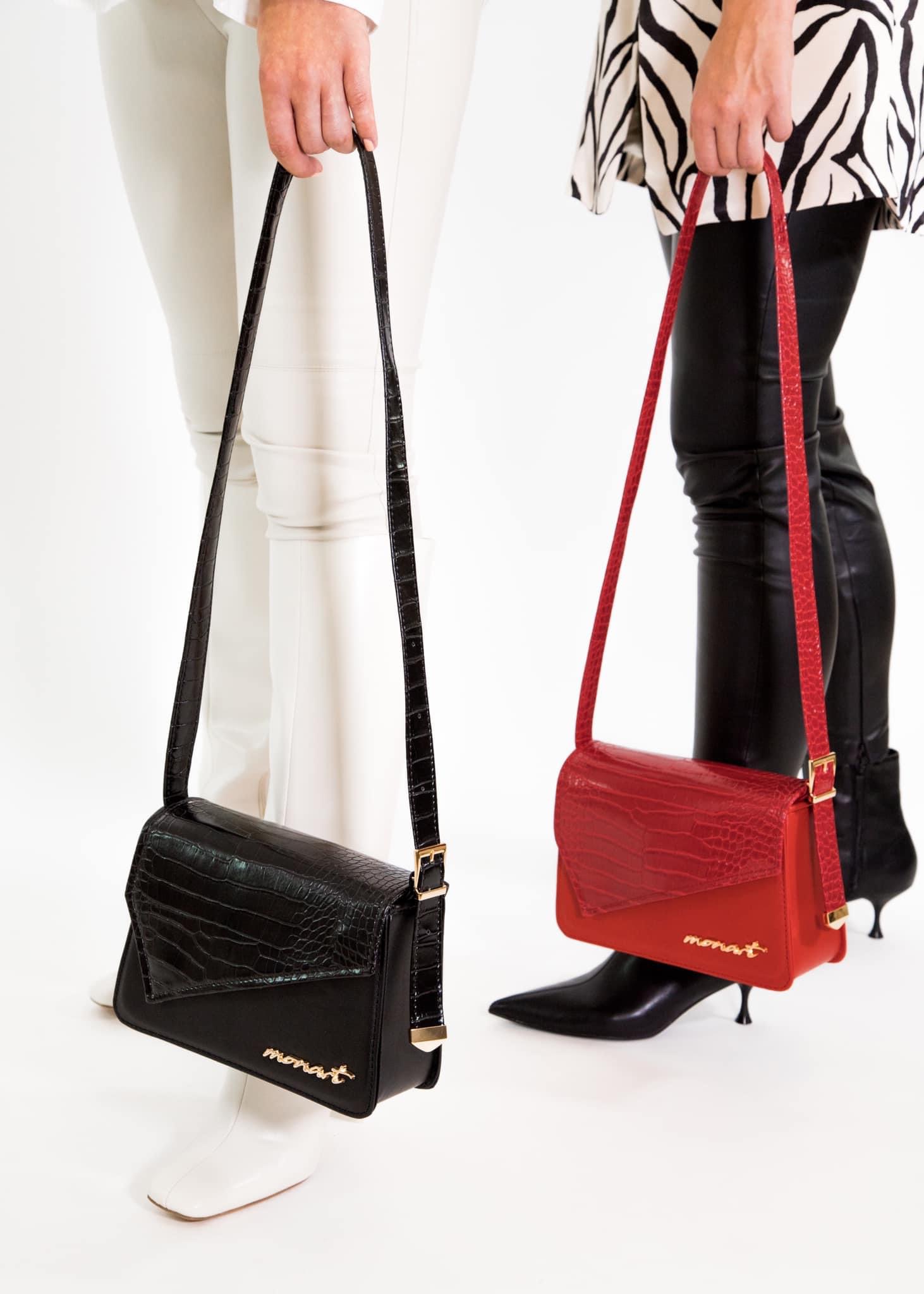 Model VALENCIA je dimenzija 23x14x6 cm, ima dugi crossbody remen s ukrasnom kopcom, a dolazi u 3 kombinacije boja s kroko uzorkom, crna, crvena i nude.